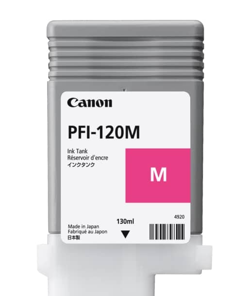 La cartouche d’encre Canon PFI-120M Magenta de 130 ml offre des couleurs éclatantes et une qualité d’image professionnelle pour vos traceurs iPF TM 200, 205, 300, 305, GP 200, et 300.