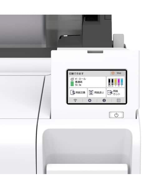 Fonctionnalités intuitives Design fonctionnel doté d’un écran tactile de 4,3 pouces affichant des instructions intuitives et des informations importantes, telles que le type de support, la quantité de support et d’encre restante. Le chargement de la bobine est facilité en utilisant le couvercle supérieur plat.
