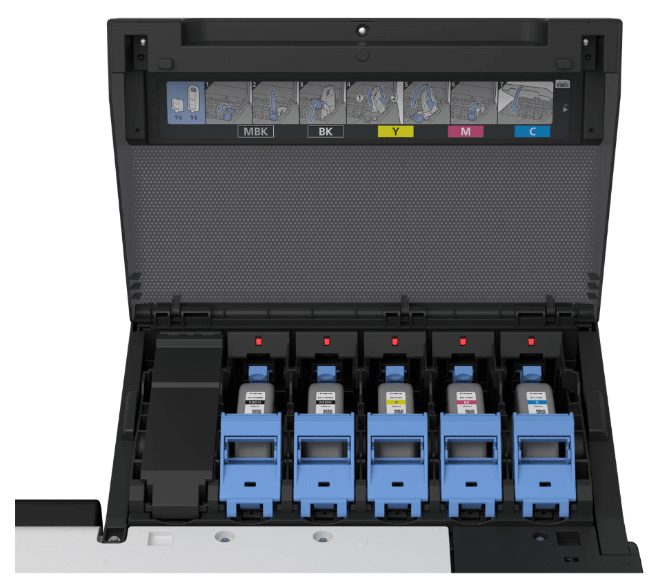 L’imagePROGRAF TX-3200 utilise une encre pigmentaire en cinq couleurs : noir mat, noir, cyan, jaune et une nouvelle encre magenta, garantissant des impressions précises et des couleurs vibrantes. Selon les besoins, il est possible de choisir entre trois tailles de réservoirs d’encre (700 ml, 330 ml, 160 ml) pour optimiser la gestion des consommables en fonction du volume d’impression quotidien.